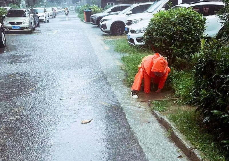 各职能部门也迅速响应,形成防汛合力。城管队员冒雨清理排水口杂物,在积水路段设置警示标识,协调抽水泵车现场作业。物管部门协调、督促辖区物业做好防汛物资储备和地下车库挡水板加固等相关工作。水务部门加密河道水位监测频次,及时开启闸站预排预泄,确保水位控制在安全线内。